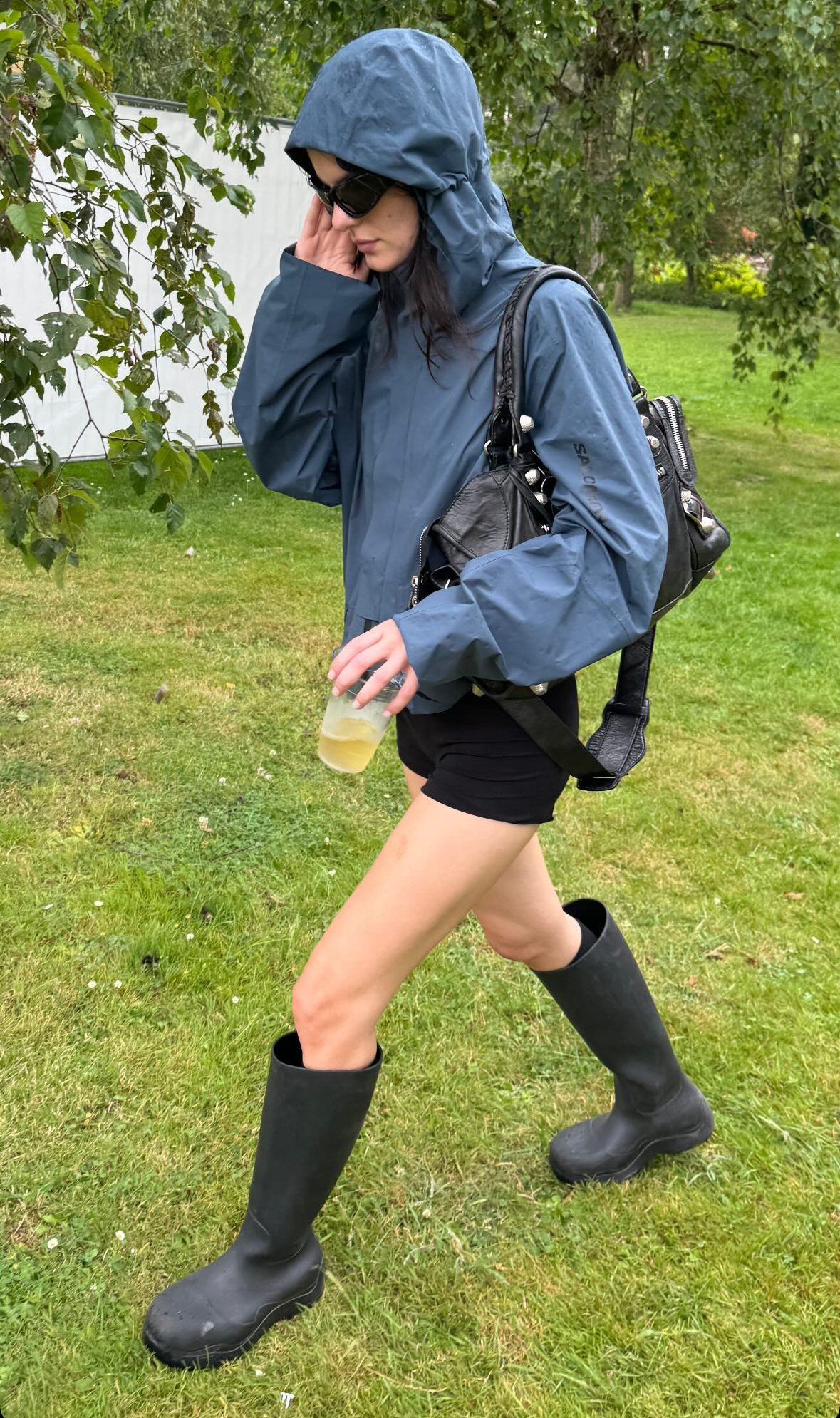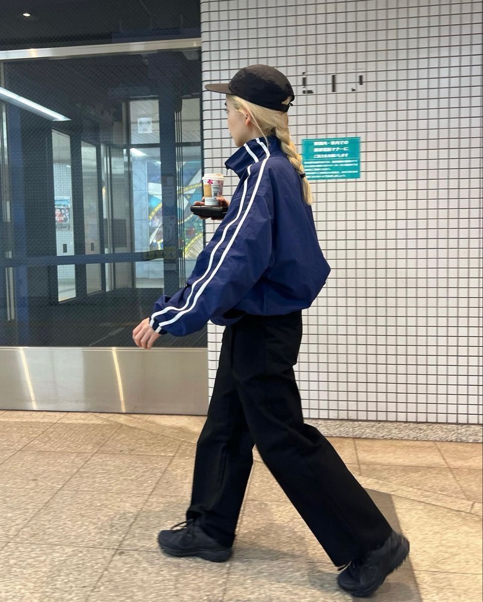 밑단 스트링이 있는 바람막이라면 살짝 조여서 크롭 기장으로 연출해 다리를 더 길어 보이게 만들어보세요!