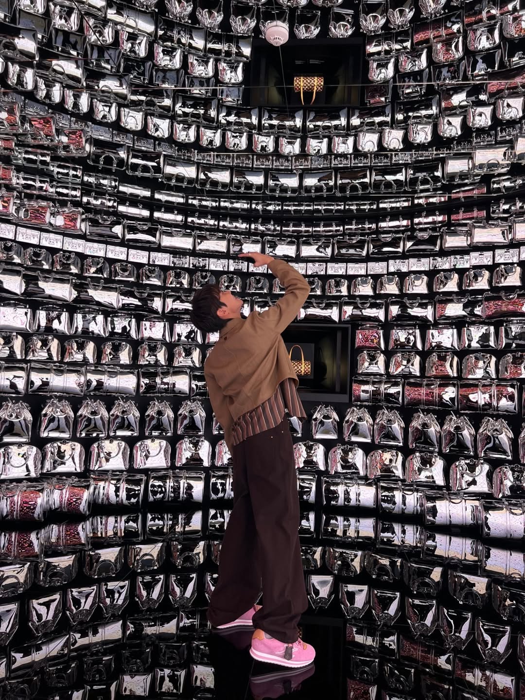 올블랙, 그레이, 화이트 톤의 깔끔한 룩에 핑크 스니커즈를 매치해 보세요.